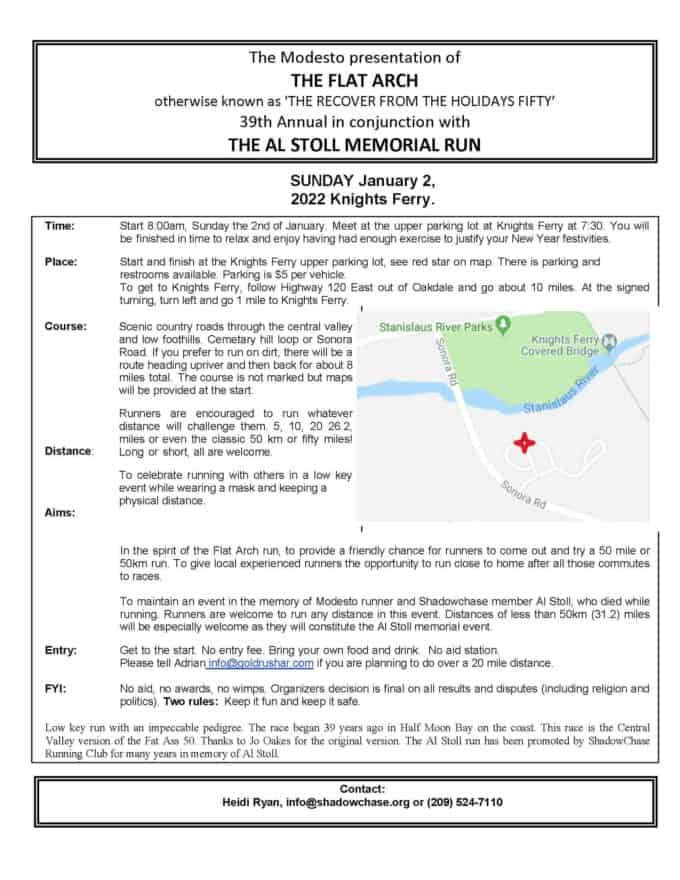 Come join us on December 31st for the 40th Annual Flat Arch Run, otherwise known as ‘THE RECOVER FROM THE HOLIDAYS FIFTY’ We are meeting in the upper parking lot in Knights Ferry at 7:30am to sign-in and take a photo, then we will start running at 8am. There is a parking fee of $5…